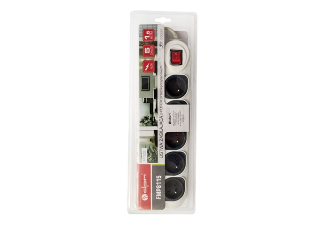 Přepěťová ochrana DPM FMP8115 s 5 uzemněnými zásuvkami a 1,5m kabelem nabízí spolehlivou ochranu vašich zařízení před přepětím.