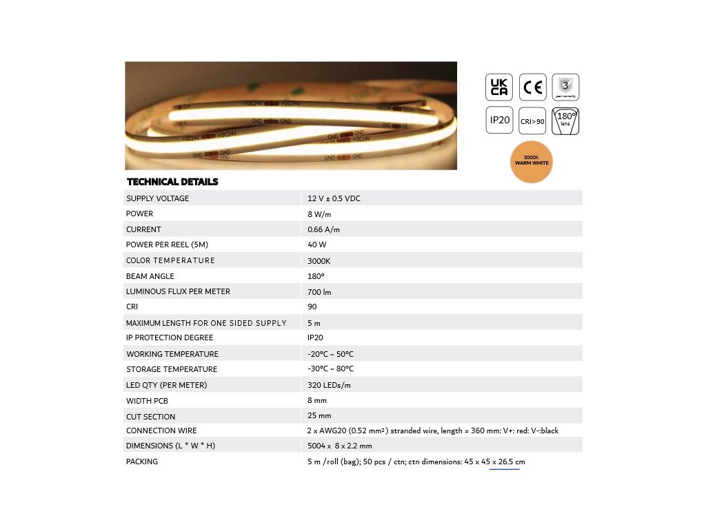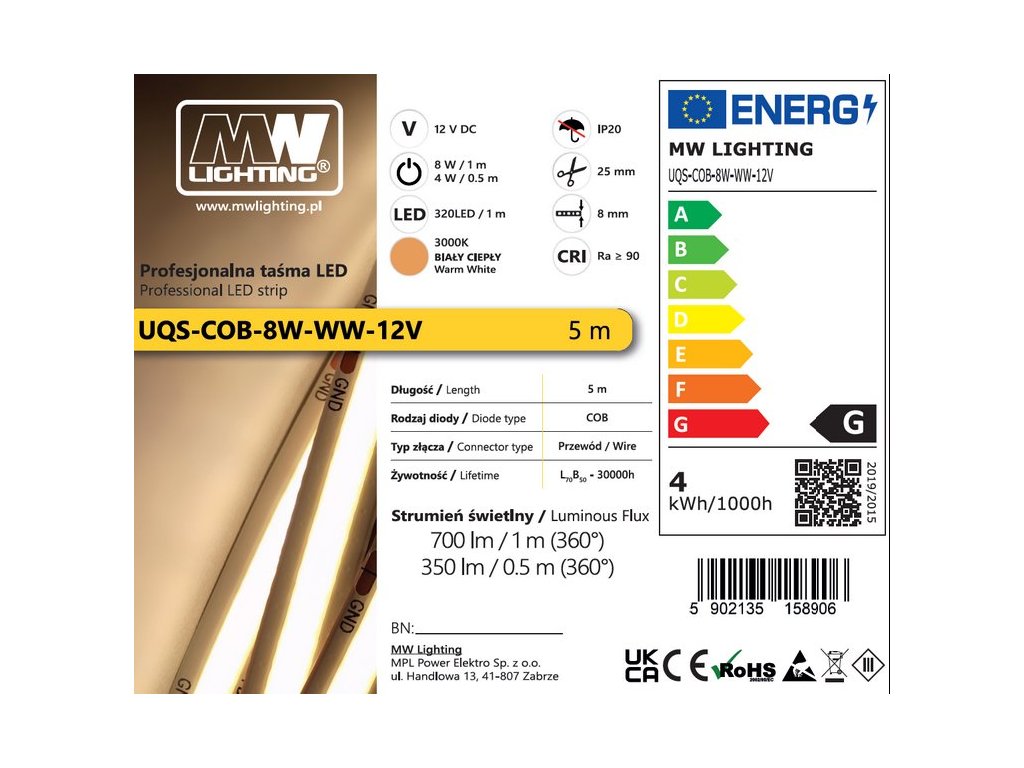 Profesionální LED pásek COB MW Lighting UQS-COB-8W-WW-12V s výkonem 8W, teplou bílou barvou 3000K a délkou 5m je ideální pro kvalitní osvětlení. S vysokým lumenovým výkonem 700lm/m a IP20 třídou těsnosti poskytuje skvělou flexibilitu pro různé aplikace.