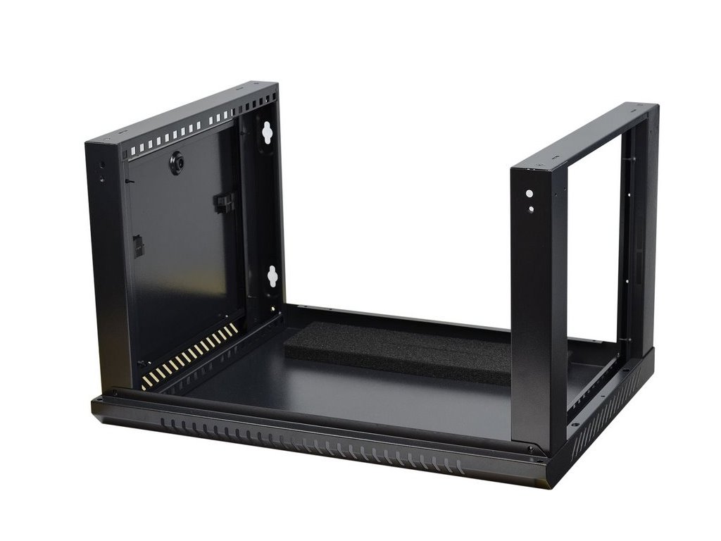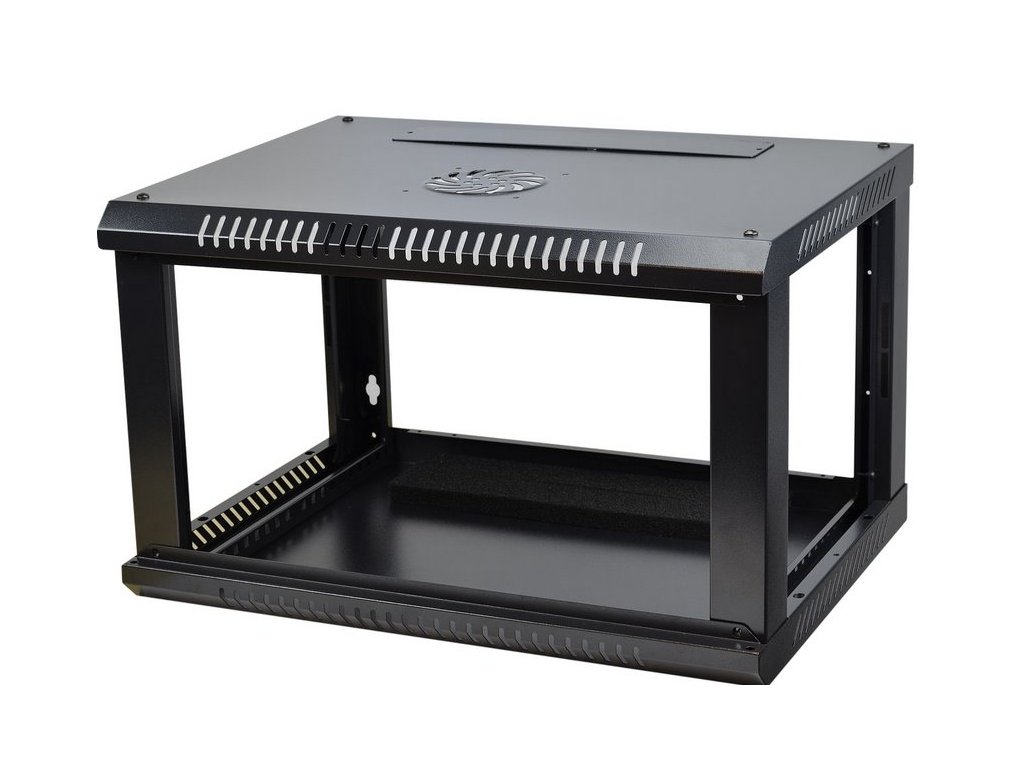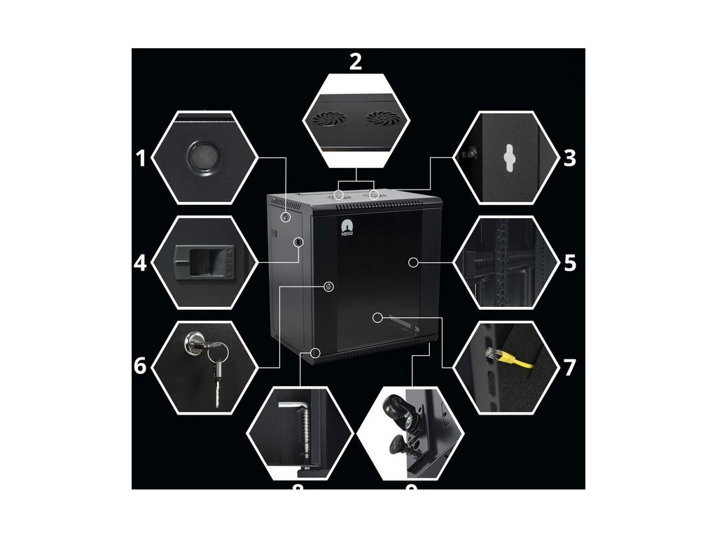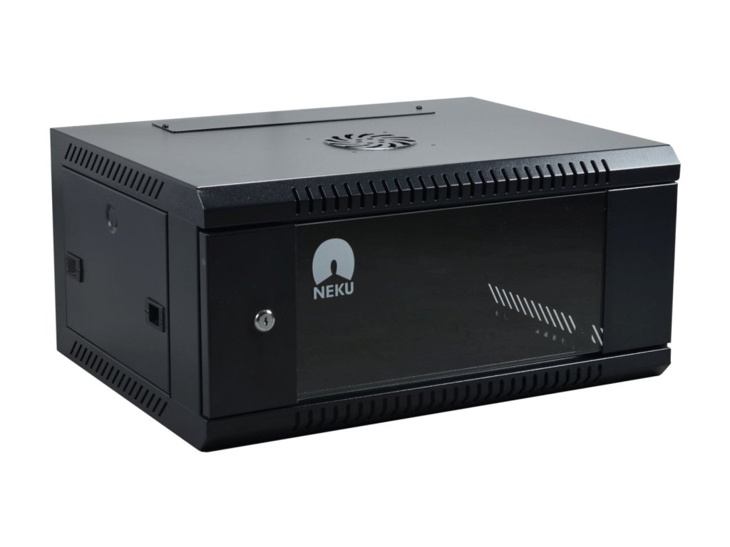 RACK skříň závěsná NEKU 19" 6U 450mm, černá se pyšní svařovanou konstrukcí z kvalitního ocelového plechu a prosklenými dveřmi, ideální pro montáž na stěnu.