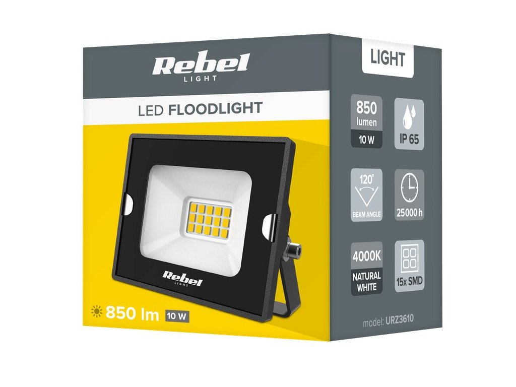 Reflektor LED REBEL URZ3610 10W 4000K, 230V nabízí světelný tok 850 lm a je odolný vůči vodě a prachu s krytím IP65, ideální pro venkovní použití. S dlouhou životností 25 000 hodin a kompaktními rozměry je perfektní volbou pro efektivní osvětlení.