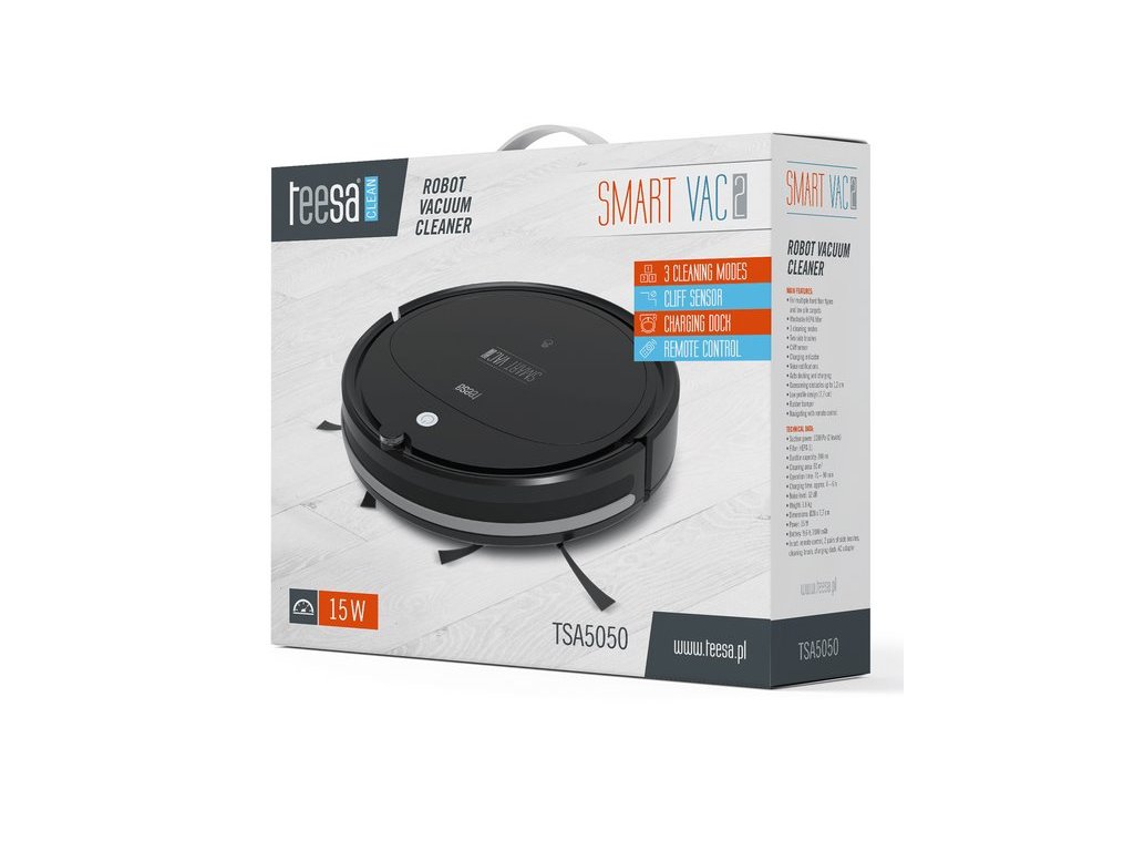 Robotický vysavač TEESA SMART VAC 2 nabízí 3 režimy čištění a 2 úrovně sacího výkonu pro efektivní úklid. S automatickým návratem na stanici a HEPA filtrem je ideální pro každodenní údržbu čistoty vašeho domova.