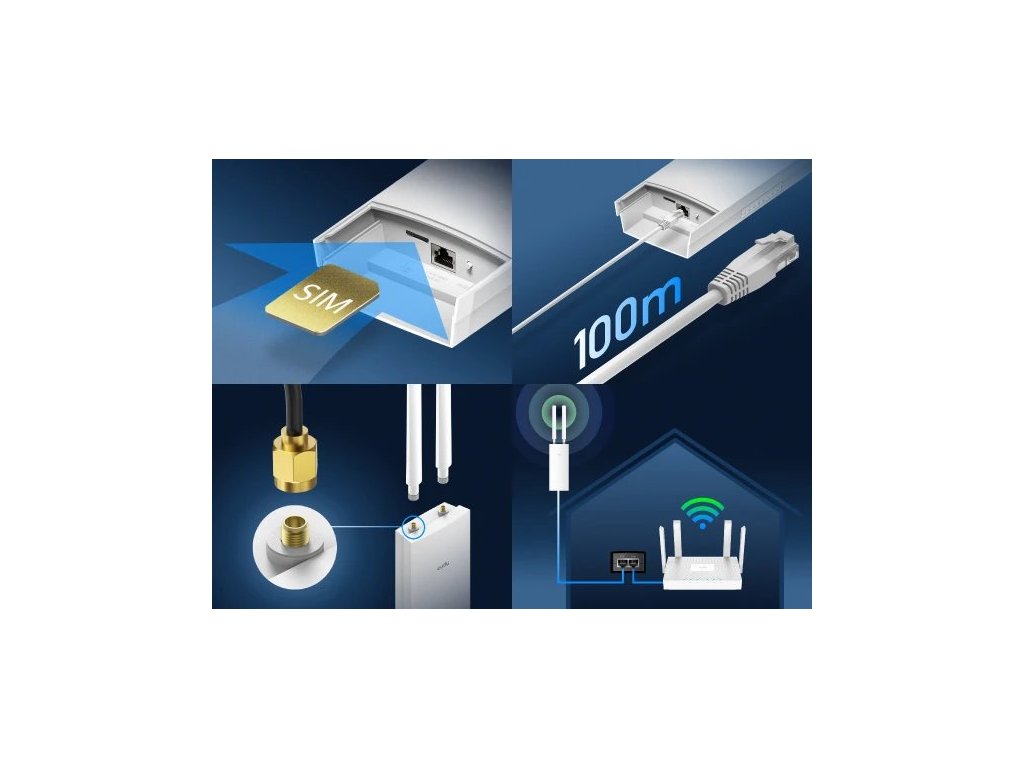 Router CUDY LT400 je navržen pro ty, kteří potřebují spolehlivé a rychlé internetové připojení v exteriéru. Tento venkovní 4G LTE router dosahuje rychlosti stahování až 150 Mb/s a odesílání až 50 Mb/s, což zajišťuje plynulé načítání webových stránek a sledování videa. S krytím IP65 je CUDY LT400 odolný vůči povětrnostním vlivům, což ho činí ideálním pro instalaci na zahradách, parcích nebo staveništích. Zařízení je kompatibilní s externí SIM kartou a umožňuje snadné připojení dalších zařízení přes LAN/WAN port.