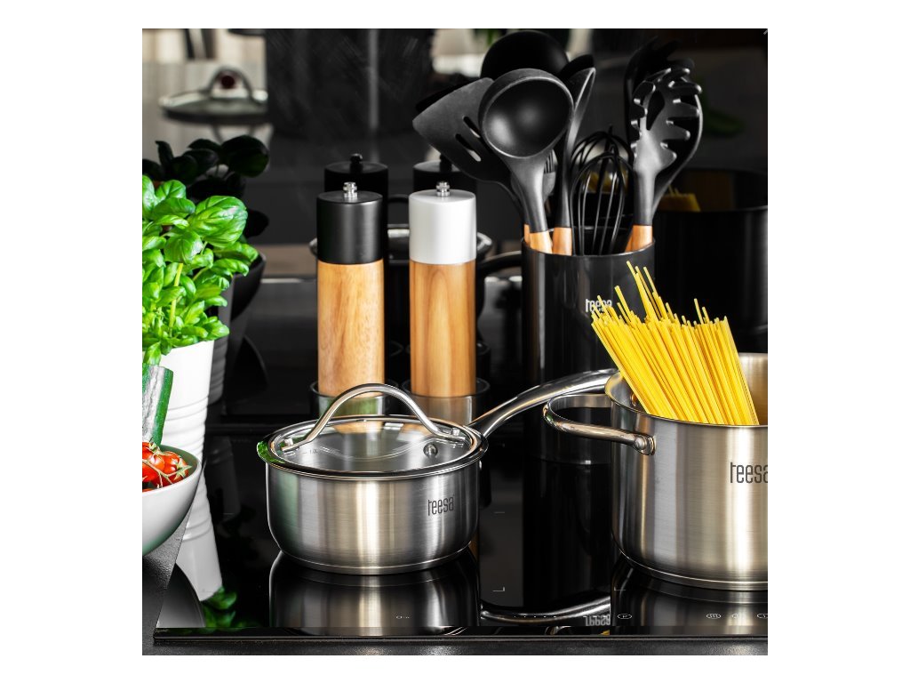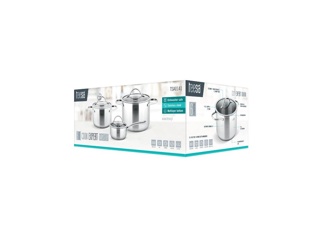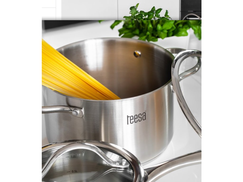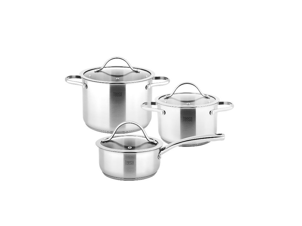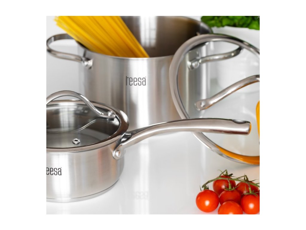 Masivní nerezové hrnce jsou základem každé kuchyně. Proto byla připravena sada hrnců Teesa COOK EXPERT MASTER. Sada obsahuje: nerezový hrnec o objemu 6 litrů a 3 litry, 1 litrový rendlík a tři poklice, tedy perfektní sadu, která vám pomůže připravit různé druhy pokrmů. Vhodná konstrukce hrnců s profilovanými okraji podporuje komfort používání a snižuje riziko rozlití jídla na sporák a pracovní desku.