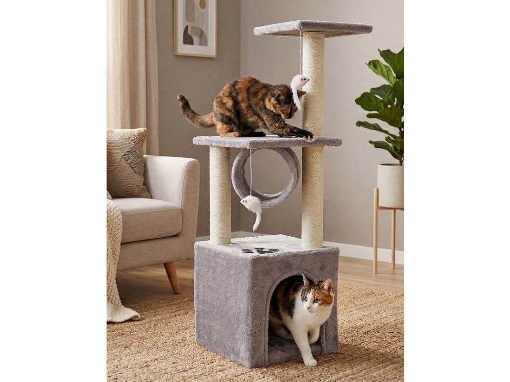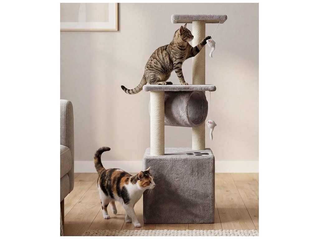 Rozsáhlá konstrukce se dvěma plošinami, tunelem a zavěšenými myšmi vytváří atraktivní prostředí pro hru a objevování. Vaše kočka může na pohyblivých prvcích lézt, schovávat se a lovit, což stimuluje její lovecké instinkty. To je ideální řešení pro aktivní kočky, které potřebují různé podněty.