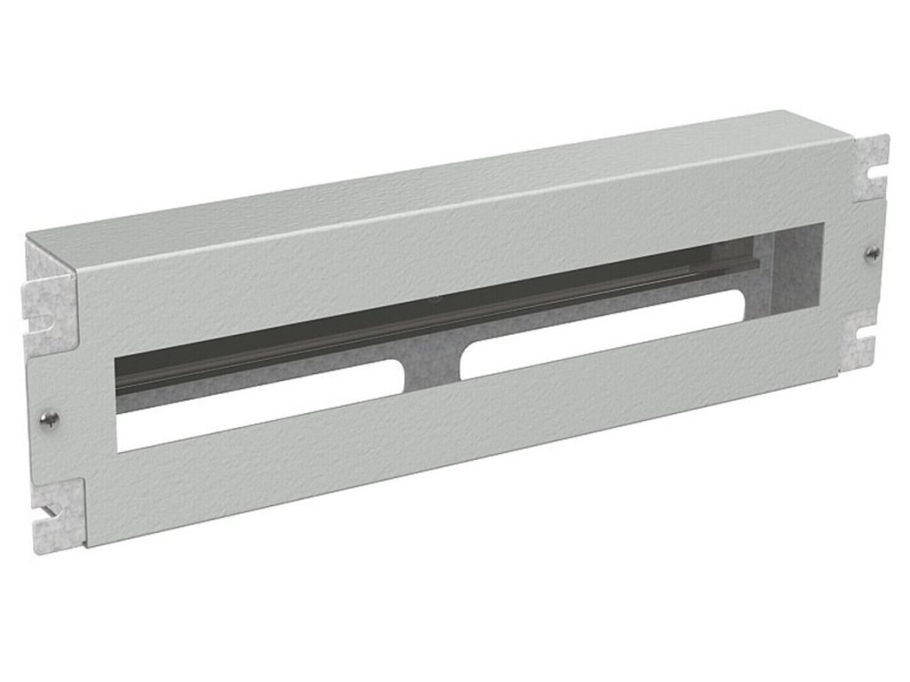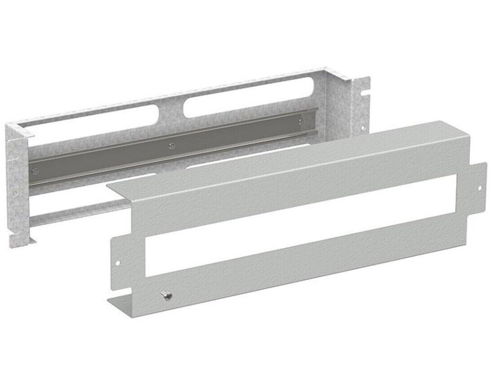 - Dodávka zahrnuje prázdný instalační panel (1 ks), základnu s DIN lištou a uzemňovacím šroubem, přední kryt a montážní materiál pro upevnění předního krytu.