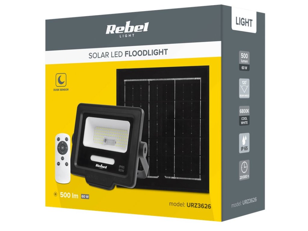 Solární reflektor REBEL URZ3626, 500lm, IP65, 6800K, 3,2 V, 4000mAh, 6W, černá