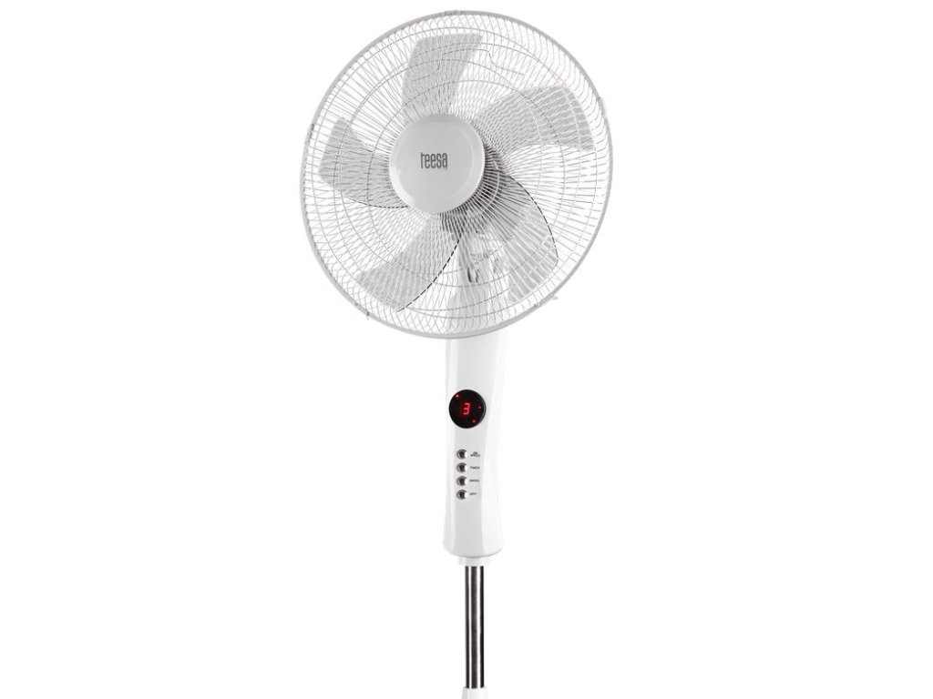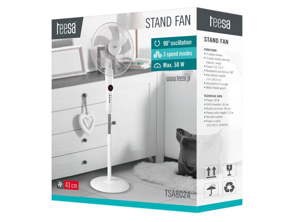Velký průměr vrtulí, poháněný 50 W motorem, v kombinaci s automatickým oscilací 90 ° způsobí, že ventilátor snadno vychladne větší místnost. Domácí ventilátor Teesa je vybaven funkcí časovače, což znamená, že můžete nastavit čas pro automatické vypnutí. Jednou z výhod zařízení je také nastavitelná výška a schopnost měnit úhel sklonu.
