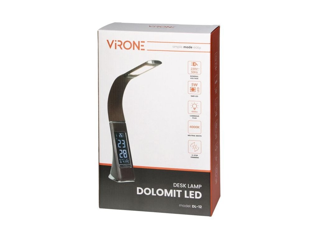 Stolní lampa s budíkem VIRONE DOLOMIT DL-12/B je skvělým řešením pro všechny, kteří hledají praktické a elegantní osvětlení do svého pracovního prostoru či ložnice. Díky výkonu 5W a světelnému toku 400lm poskytuje dostatek světla pro efektivní práci nebo relaxaci. Barevná teplota 4000K zajišťuje neutrální bílé světlo, které je příjemné pro oči a vytváří příjemnou atmosféru. Tato lampa je vybavena multifunkčními funkcemi, včetně hodin, budíku, kalendáře a teploměru, což z ní činí praktického pomocníka do každého domova či kanceláře. Její moderní design v černé barvě s plastovým a koženým pouzdrem se hodí do různých interiérů a její nastavitelnost a ohýbatelnost umožňují přizpůsobit světlo podle vašich potřeb.