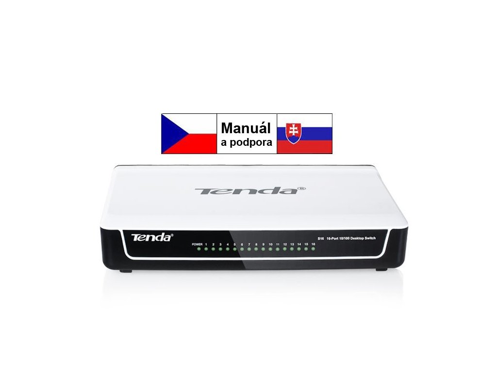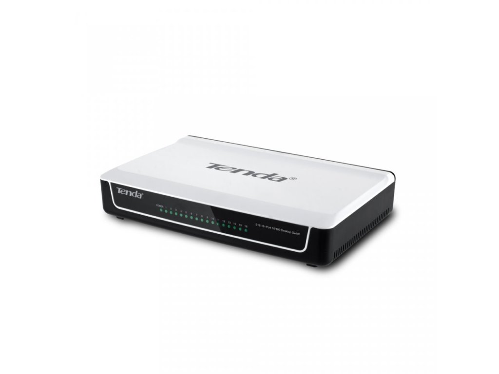 Tenda S16 je 16portový Fast Ethernet switch s přenosovou rychlostí 10/100 Mb/s, ideální pro domácnosti a menší firmy. Vyniká jednoduchou instalací a automatickou detekcí kabelů.