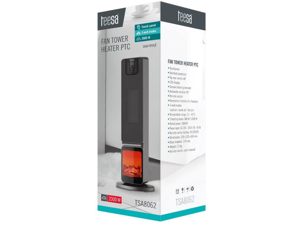 Ohřívač Teesa je vybaven bezpečnostními prvky, jako je ochrana proti přehřátí a automatické vypnutí při převrácení, což zajišťuje bezpečný provoz. Díky kompaktním rozměrům a nízké hmotnosti je snadno přenosný a vhodný pro použití v různých místnostech vašeho domova.