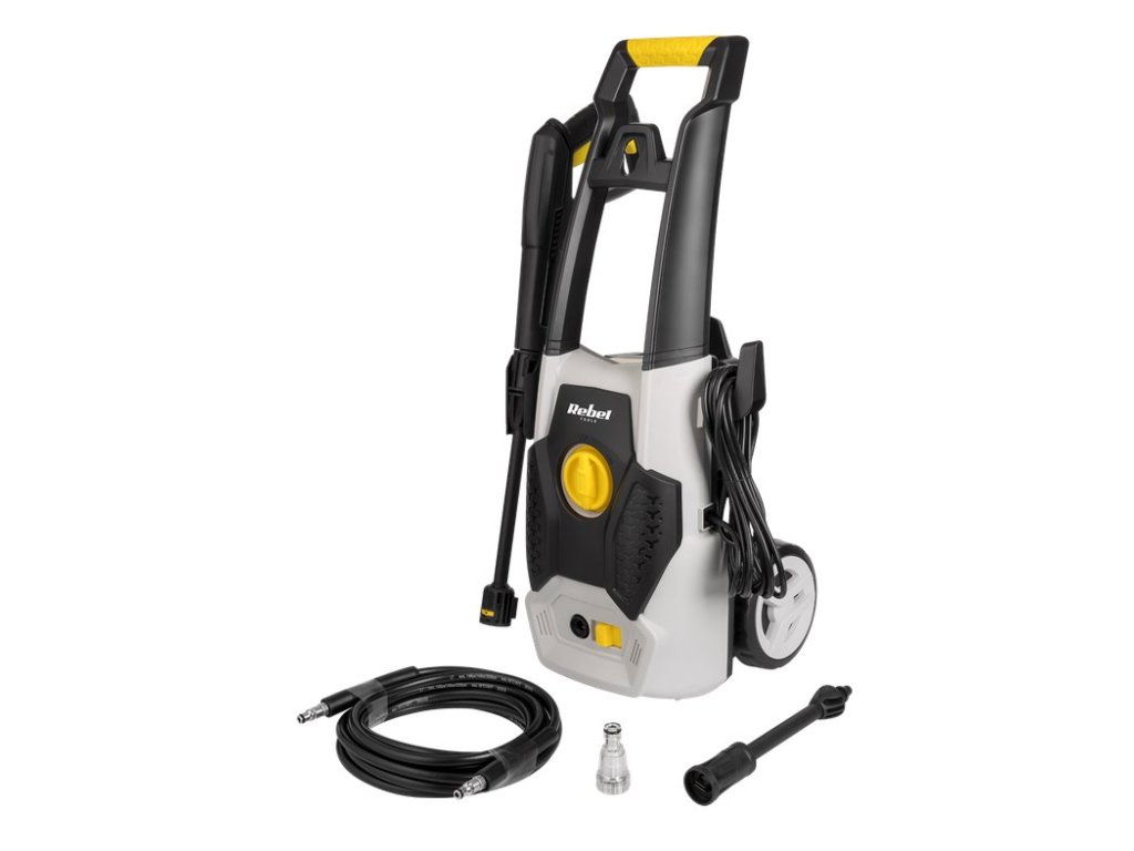 Tlaková myčka **Rebel RB-5010** je vybavena motorem o příkonu 1200 W. V kombinaci s účinným čerpadlem, které vytlačuje 330 litrů vody za hodinu, dokáže vyvinout tlak až 100 barů. Tento výkon efektivně odstraní odolné nečistoty z různých typů povrchů.