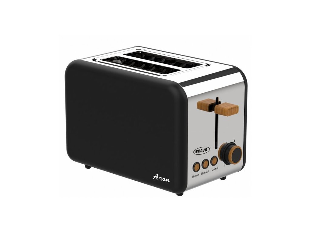 Topinkovač Bravo Aran B-4935 v elegantním černém designu s regulací opékání a funkcí rozmrazování pro dokonalé topinky.
