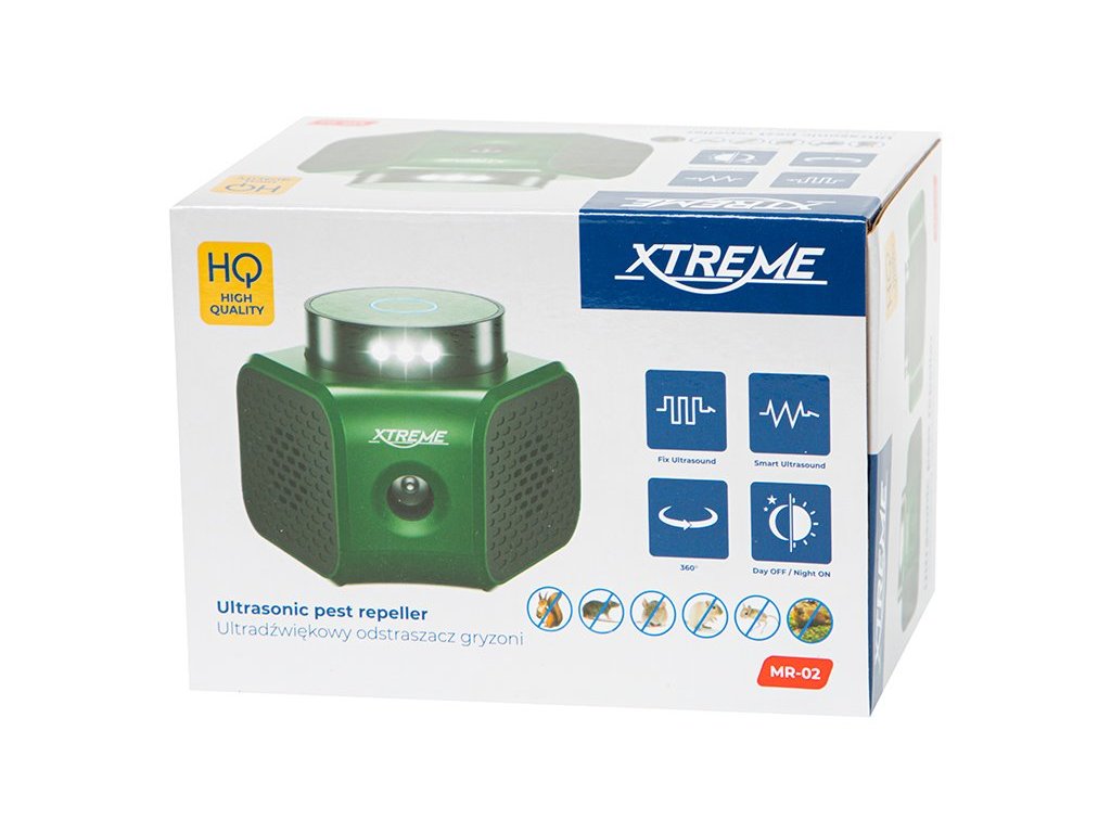 Zařízení akusticky i vizuálně odpuzuje hlodavce jako jsou myši, krysy, kuny a další. Disponuje 360stupňovou detekcí. Je ideální pro uzavřené místnosti, v každém domě, sklepě, garáži nebo na pracovišti. Produkt vysílá ultrazvukové signály s proměnnou frekvencí a účinně odpuzuje škůdce. Má několik provozních režimů, LED diody, které mohou pracovat v noci, reproduktor vyzařující ultrazvuk a měniče vyzařující tlakovou vlnu.
