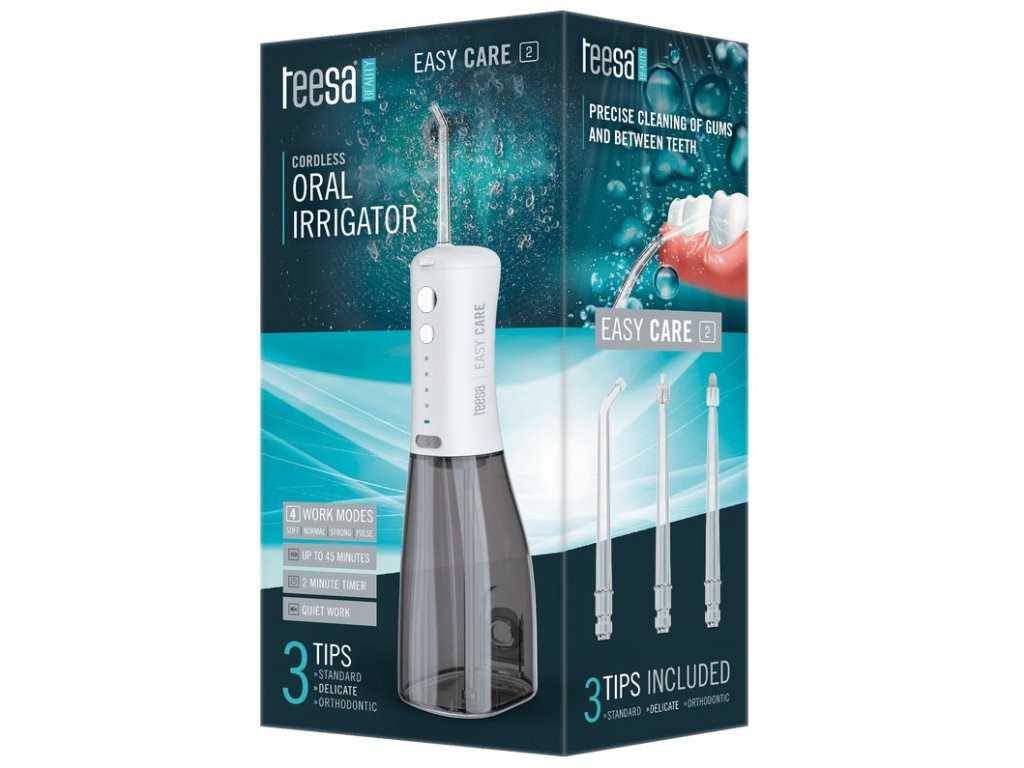 Ústní sprcha TEESA TSA8080 EASY CARE 2 nabízí čtyři provozní režimy pro efektivní čištění a vyměnitelné koncovky pro individuální potřeby. S bezdrátovým designem a výdrží až 45 minut je ideální pro každodenní použití doma i na cestách.