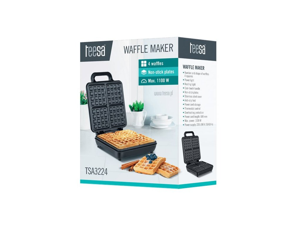 Vaflovač TEESA TSA3224 s výkonem 1100 W připraví až čtyři vafle najednou. Užijte si křupavé vafle bez připalování díky nepřilnavým deskám a bezpečnostním funkcím.