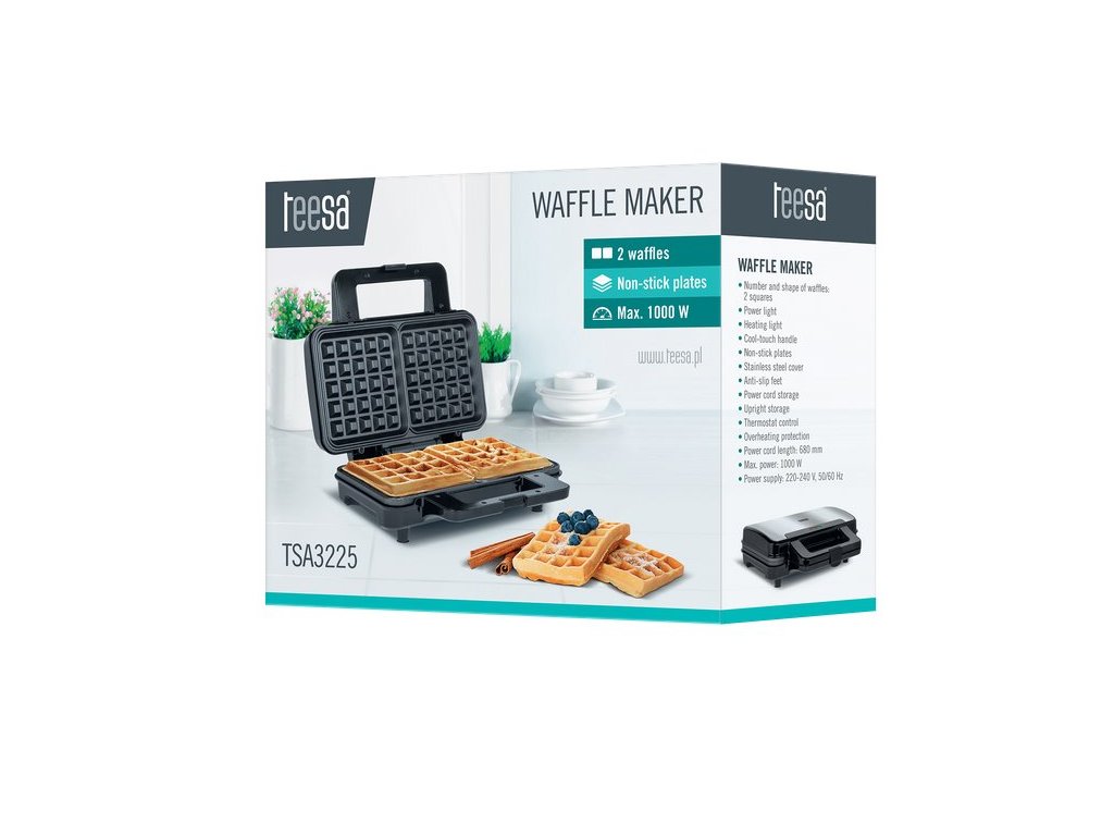Vaflovač TEESA TSA3225 umožňuje připravit dva čtverečkové vafle najednou s teflonovým povrchem pro snadné čištění a bez lepení. Jeho nerezová konstrukce a bezpečnostní prvky, jako ochrana před přehřátím, zajišťují pohodlné a bezpečné používání.