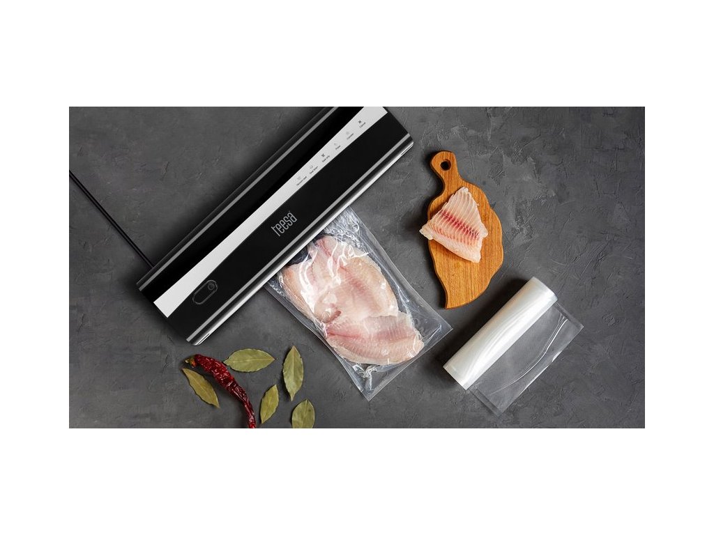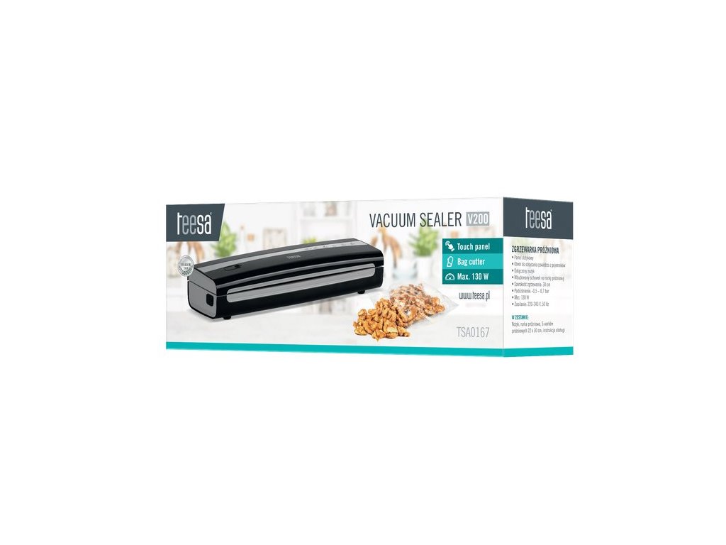 Vakuová balička potravin TEESA V200 zajišťuje dlouhou trvanlivost potravin a snadné použití díky výkonu 130 W a vakuování až 0,7 baru. Součástí balení jsou sáčky a nůž pro maximální komfort.