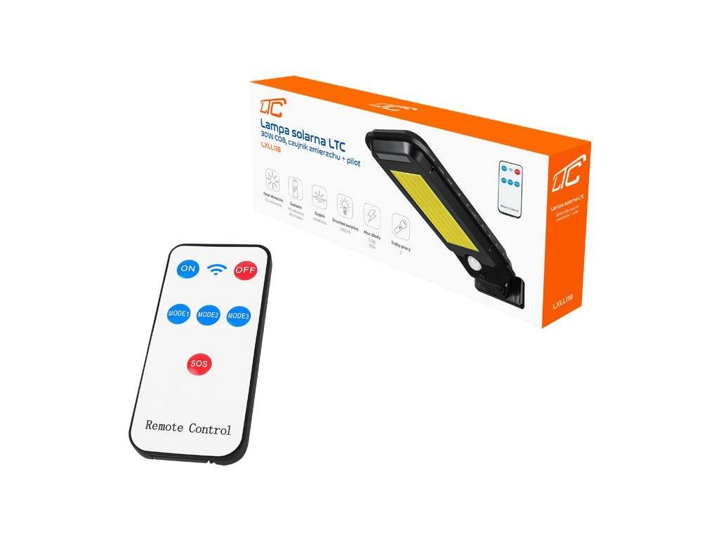 Venkovní solární LED osvětlení LTC LXLL118 s výkonem 30W a světelným tokem 2000lm je ideální pro efektivní osvětlení exteriérů. Vybaveno snímačem pohybu a dálkovým ovládáním pro snadné použití.