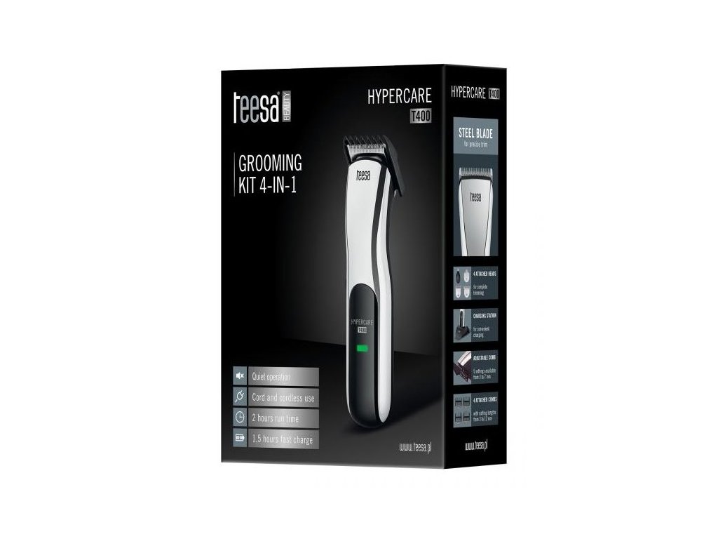 Bezdrátová souprava TEESA HYPERCARE T400 4v1 je ideální pro **komplexní osobní péči**. S možnostmi **ostříhání vlasů, úpravy vousů** a **odstranění chloupků** v nose se stane vaším nepostradatelným pomocníkem.