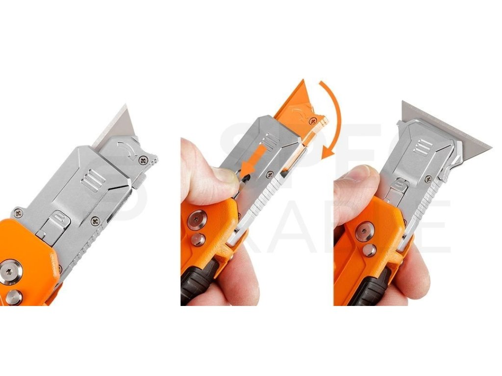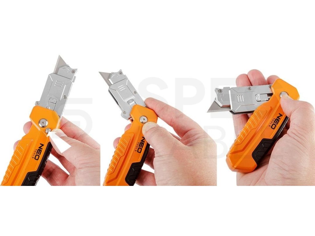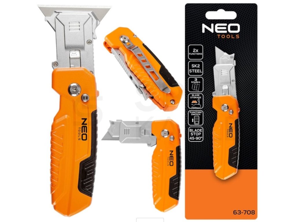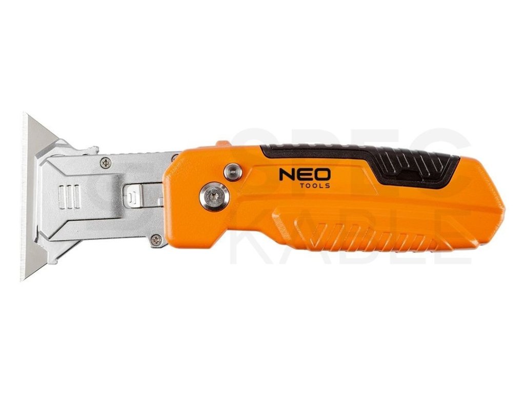 Zavírací nůž Neo Tools 63-708 s vyměnitelnou trapézovou čepelí a škrabkou